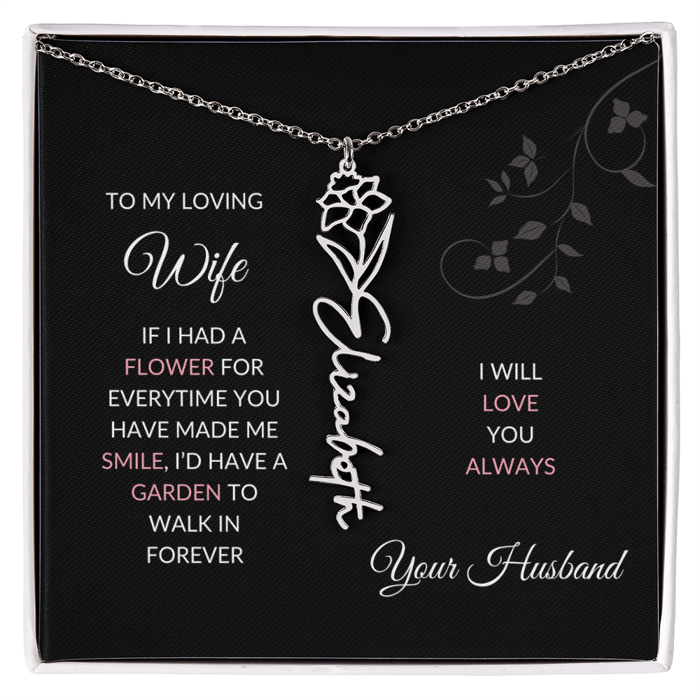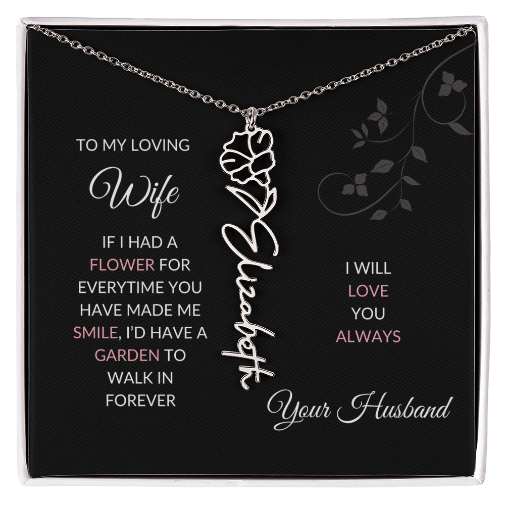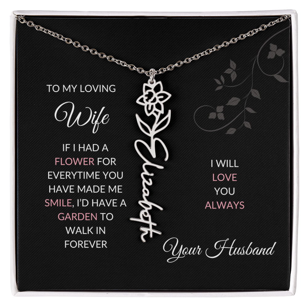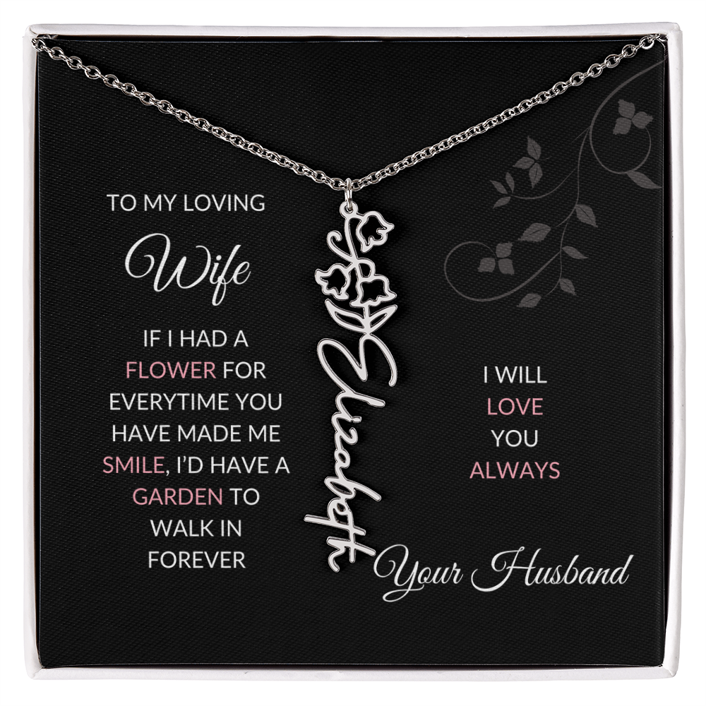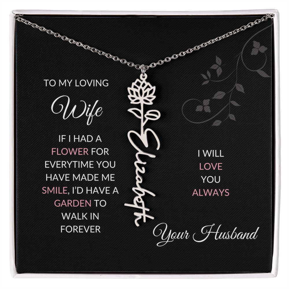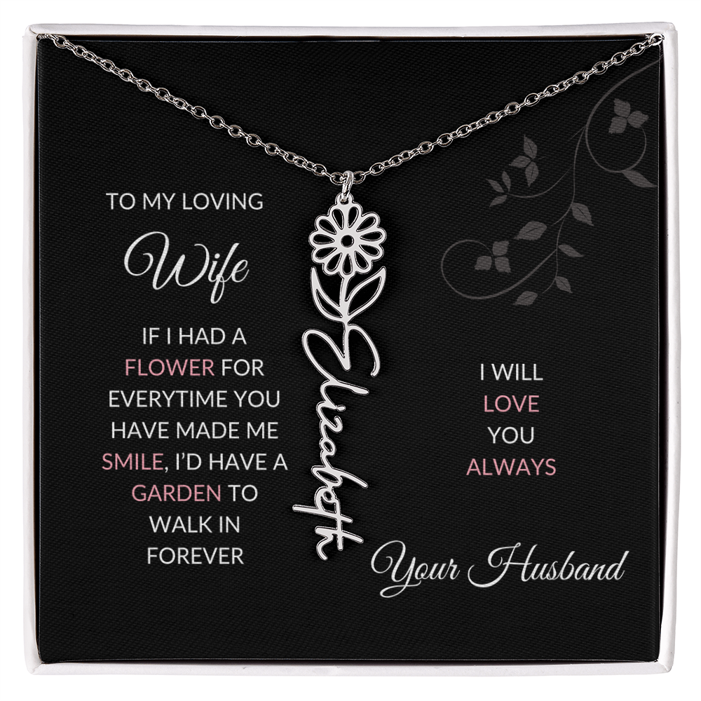Celebrate your special someone with this flower name pendant that captures personal meaning and timeless beauty. Its stylish cable chain and customizable design make it an ideal gift for your wife or partner who appreciates unique and elegant accessories. Give her a keepsake she will treasure forever—a symbol of love crafted into wearable art.