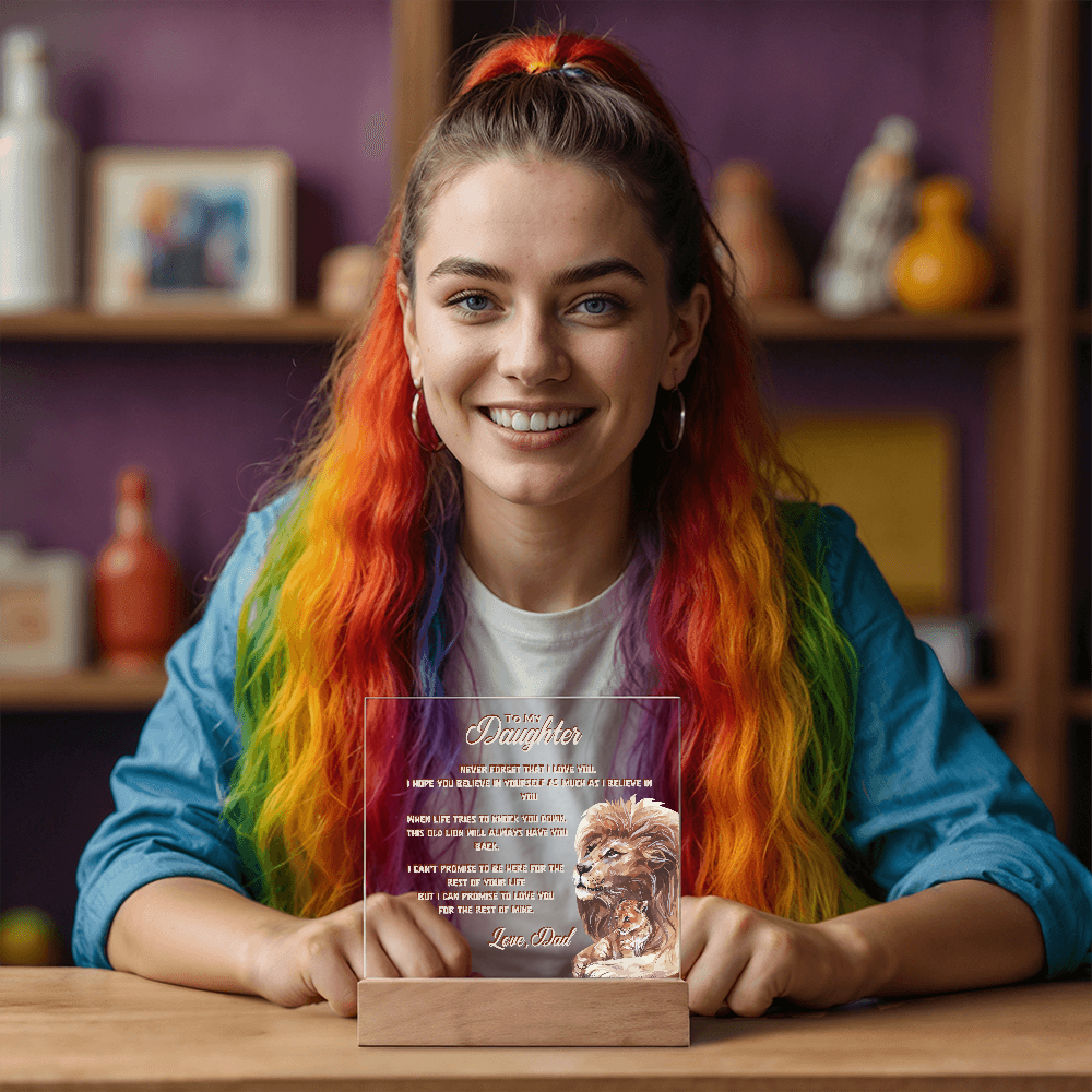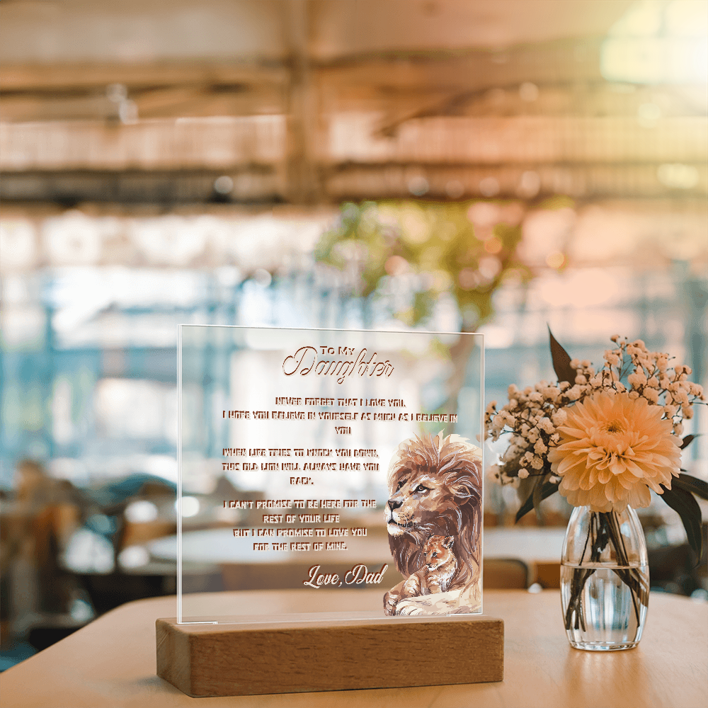 A heartfelt reminder of love, emphasizing courage, and unbreakable bonds with the Daughter and Dad with Lion & Cub design on Acrylic Plaque Led Lamp. Inspired by the fierce love of a father and the strength he passes on to his daughter, this keepsake captures a timeless promise — protection, belief, and love that never fades. Each time she sees the glowing light around this plaque, she’ll feel your words guiding her: that she’s brave enough to chase her dreams, strong enough to rise again, and forever loved beyond measure.