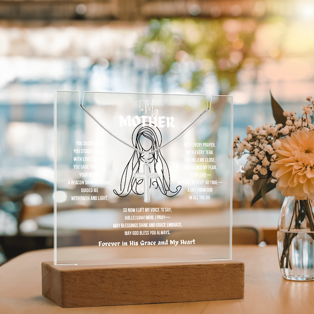 Honor your mother’s unwavering love and sacrifices with this Keepsake Acrylic & Cross Necklace Bundle—a heartfelt expression of faith, devotion, and appreciation. This beautiful set features a crystal-clear illuminated acrylic display paired with an elegant stainless steel cross necklace, creating a meaningful keepsake she’ll treasure forever.